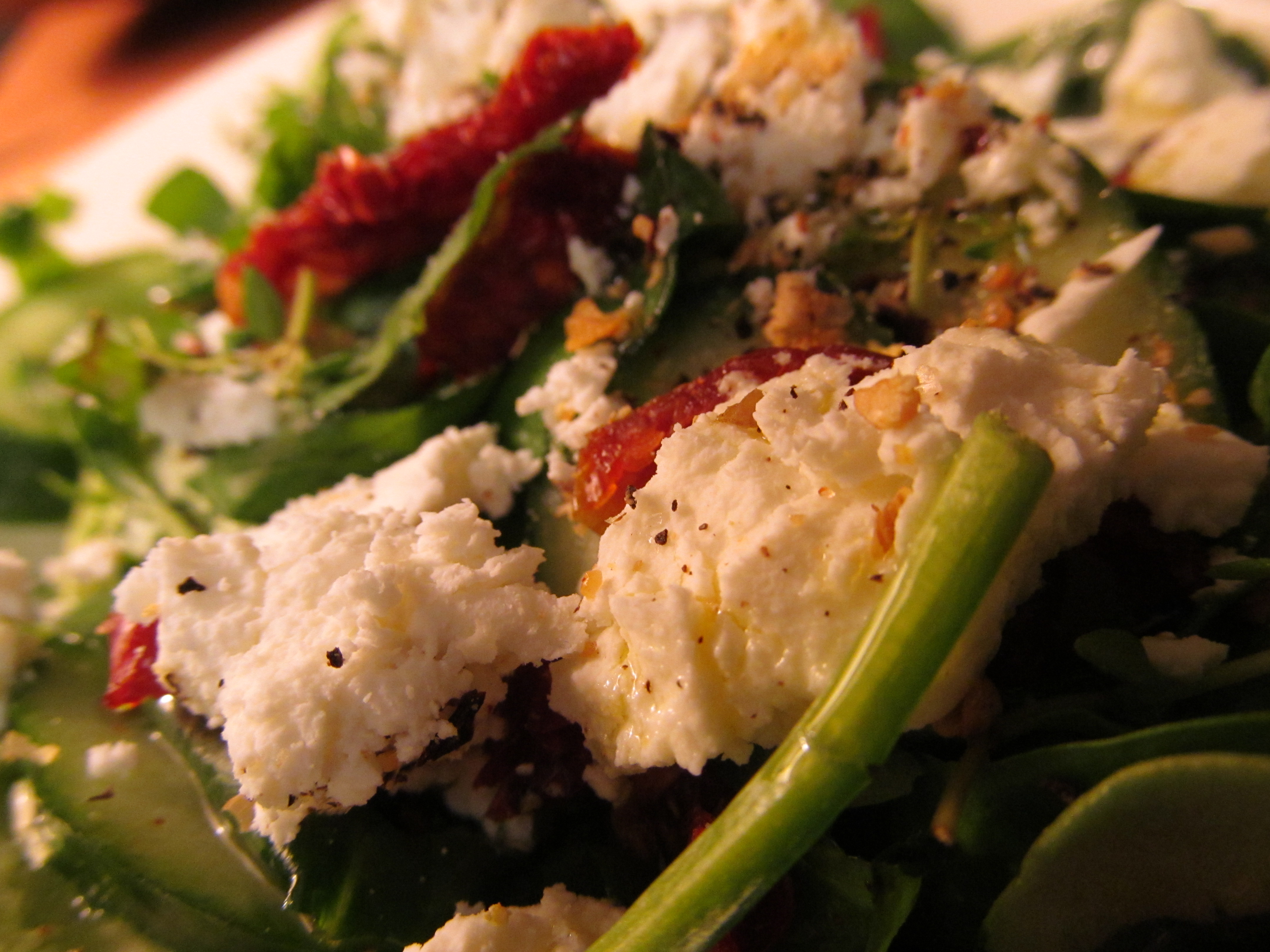 Arugula & Spinach with Persian Cucumbers, Sun Dried Tomatoes, Fresh Basil & Thyme, Drizzled with Extra Virgin Olive Oil and a grind of TJs Everyday Seasoning.